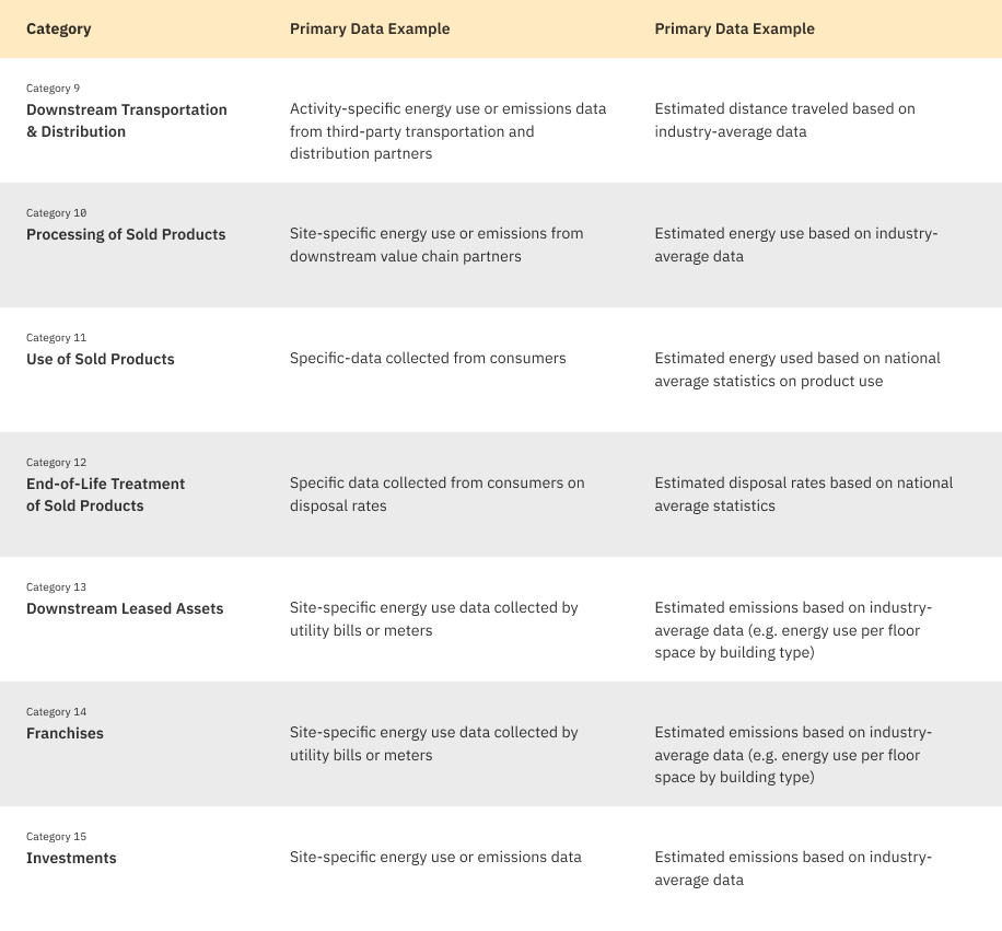 The following tables illustrate examples of primary and secondary data across the Scope 3 categories, highlighting where different data types are most commonly applied.